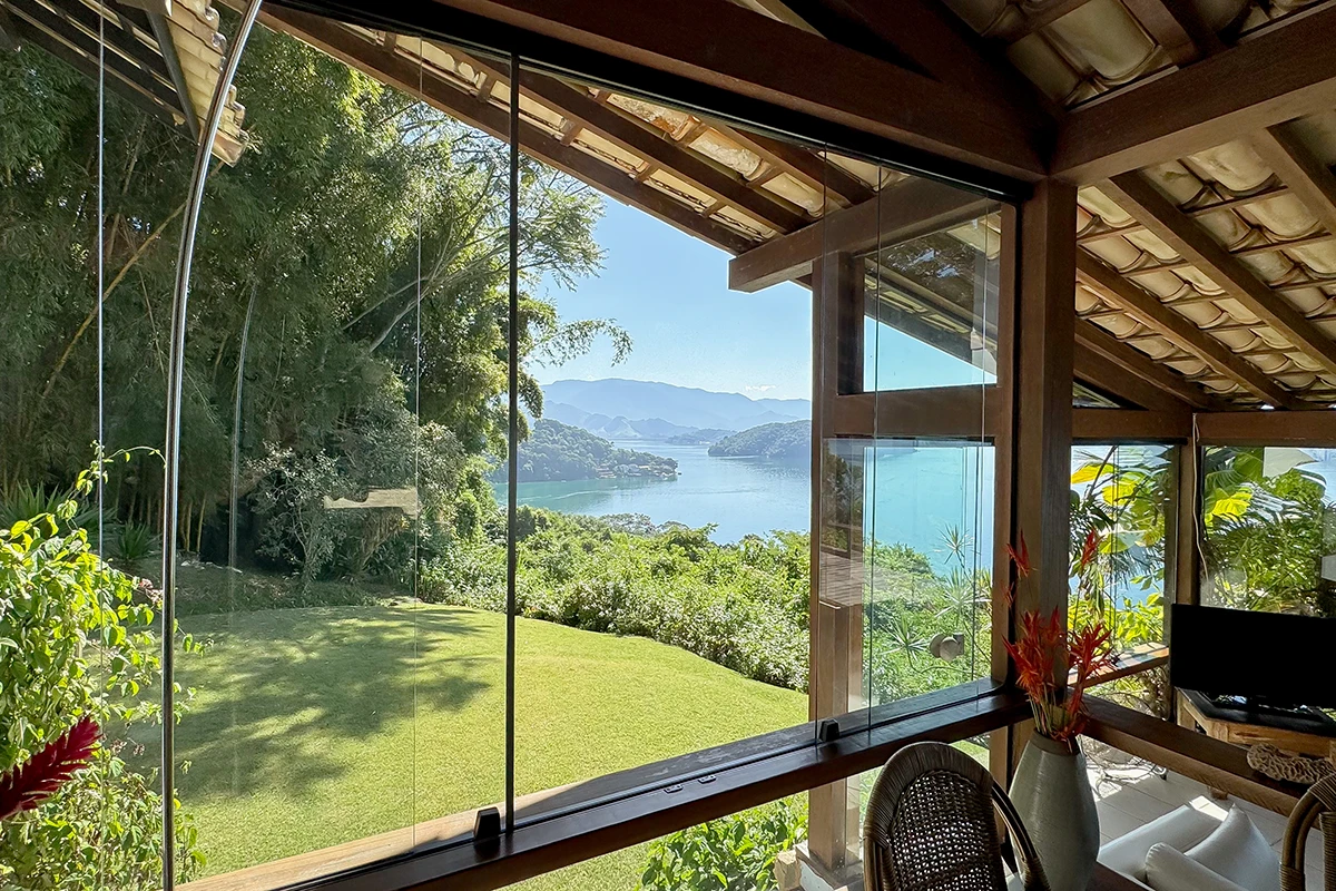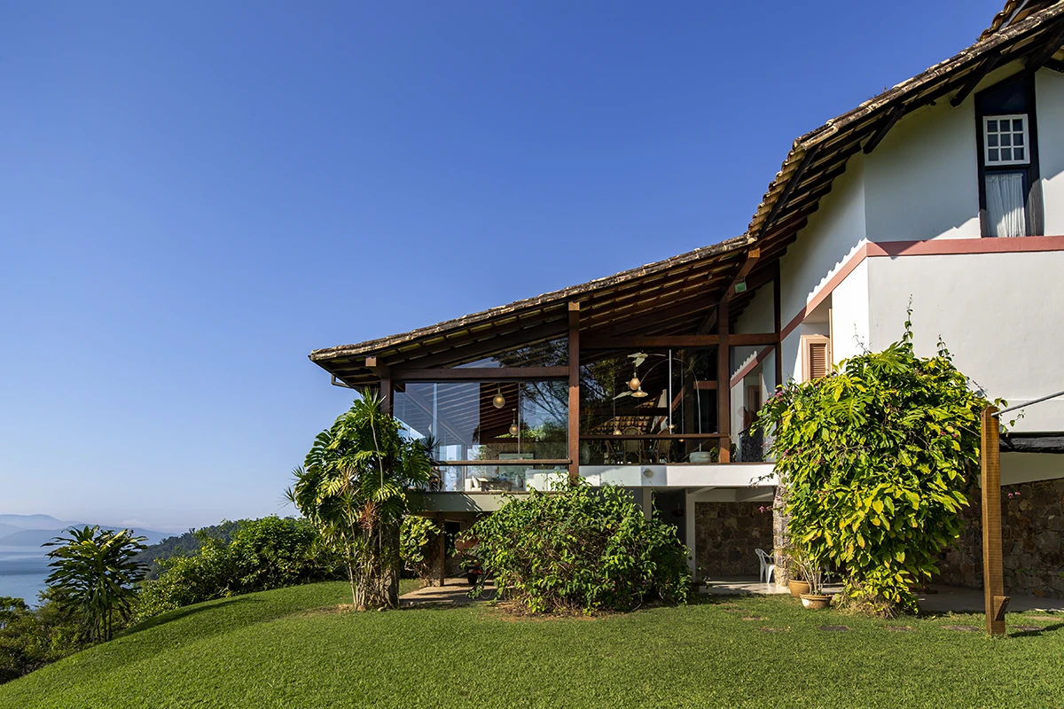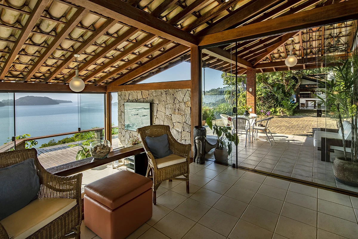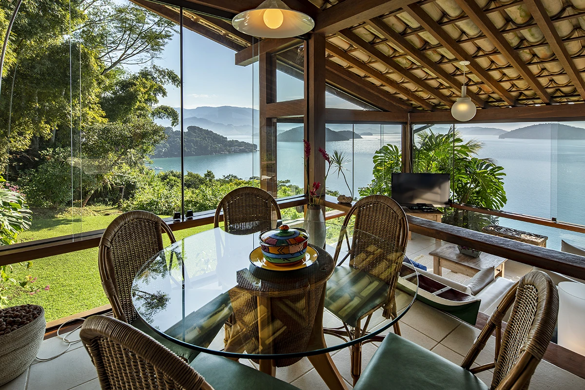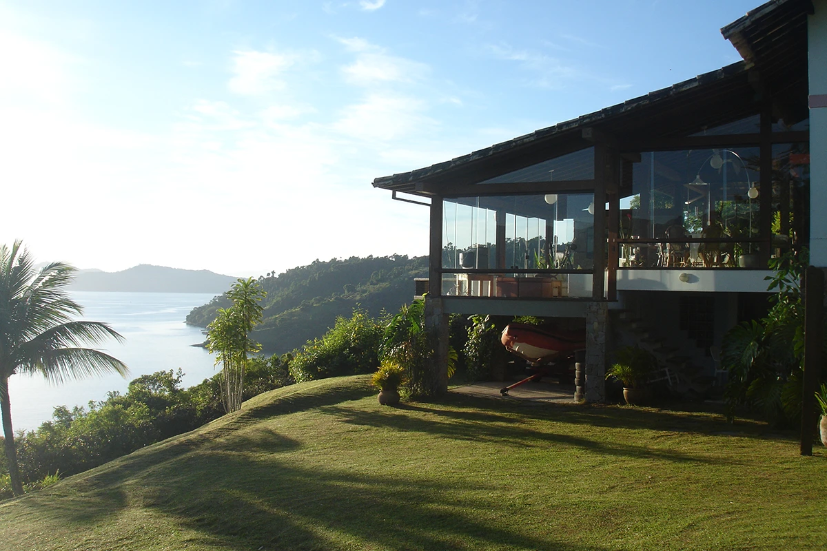 Casa situada a 80 metros do nível do mar com vista panorâmica e exclusiva da Baía da Ribeira. Possui salas de jantar, estar e TV, projetadas em um único ambiente envidraçado em diferentes níveis; cozinha panorâmica completa tipo americana; três quartos (todos climatizados), sendo duas suítes; banheiro social; área externa com varanda e amplo deck para contemplação da vista.