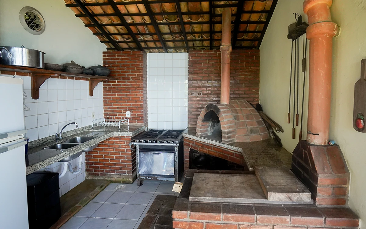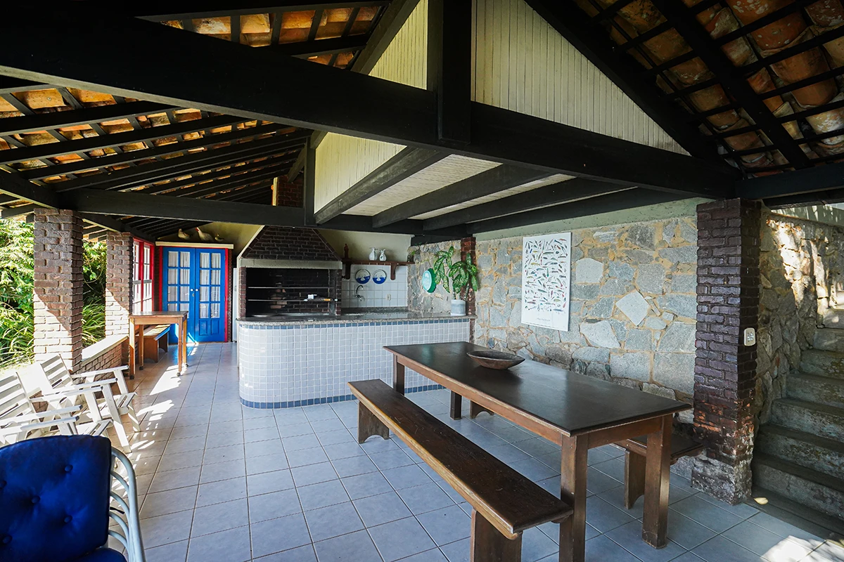 Anexo a casa, no térreo, encontra-se um charmoso e completo espaço gourmet com forno e fogão a lenha, fogão industrial e churrasqueira. Um espaço que convida você para criar momentos especiais, através da gastronomia. E no piso superior mais uma suíte com varanda e vista para o mar.