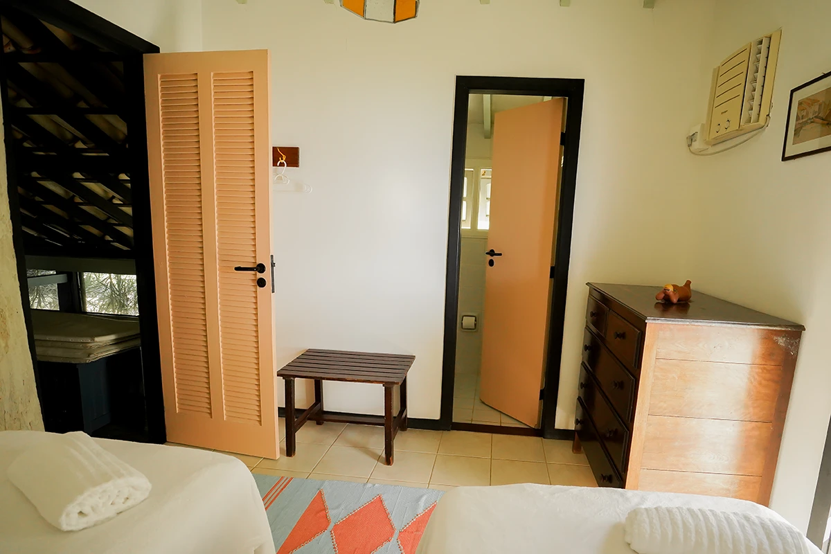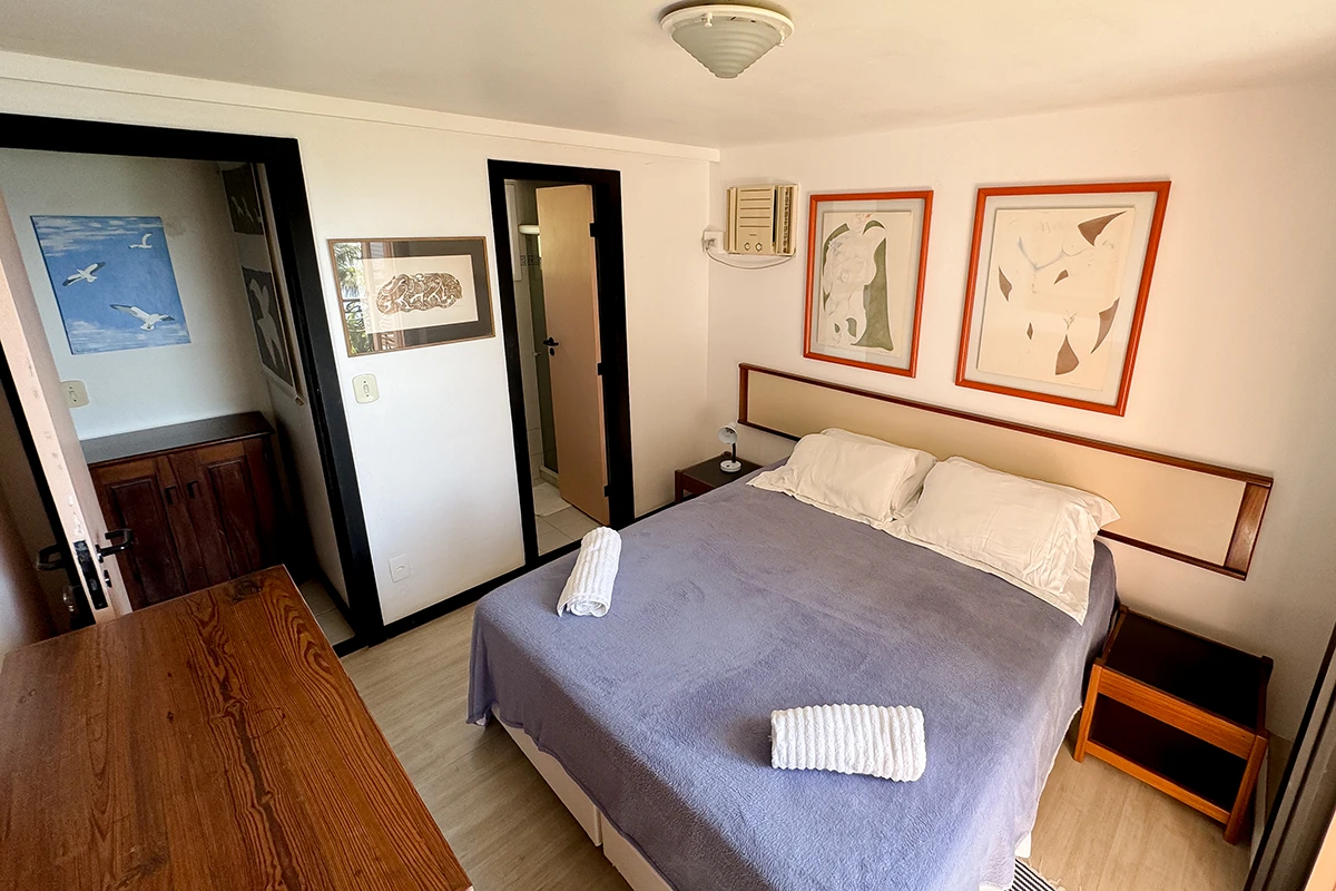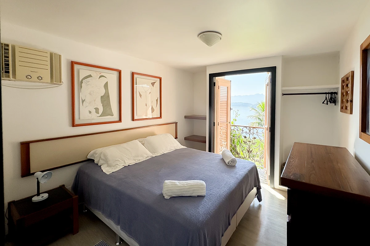 São quatro quartos no total, sendo três suítes, todos climatizados para garantir o seu conforto em qualquer estação do ano. Na casa temos uma suíte com sacada e vista para o mar, ao lado, um quarto com sacada e vista para o interior da casa e no piso superior uma suíte com vista lateral para o mar. No anexo encontra-se uma ampla suíte, que acomoda até quatro pessoas, com varanda e vista panorâmica para o mar.