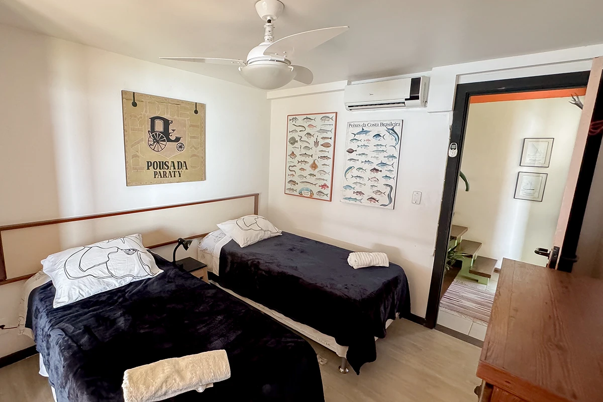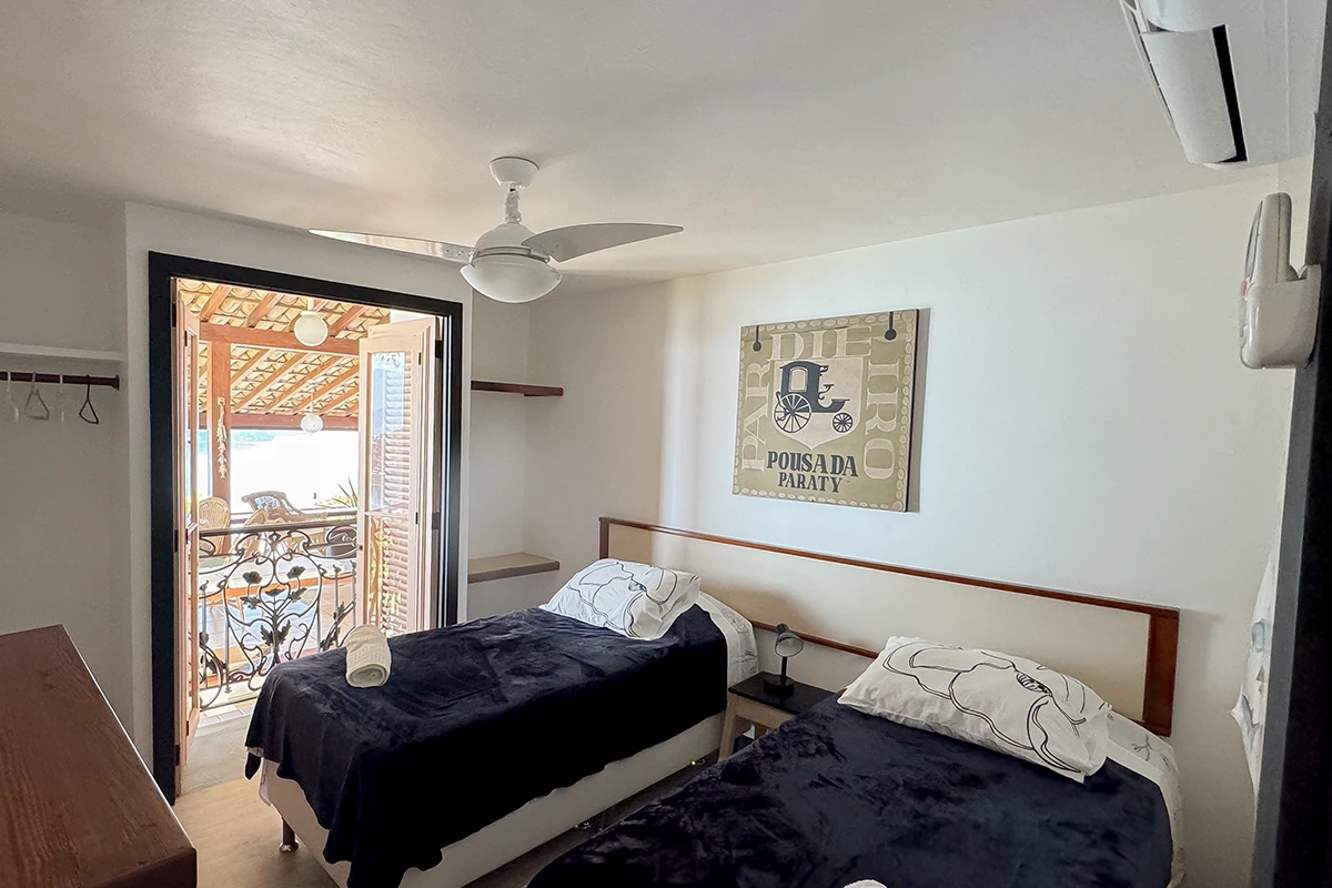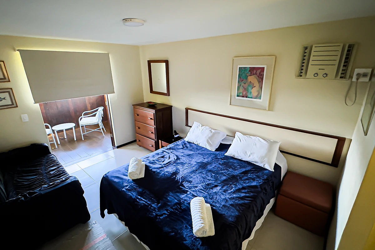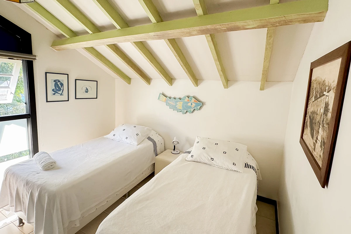 São quatro quartos no total, sendo três suítes, todos climatizados para garantir o seu conforto em qualquer estação do ano. Na casa temos uma suíte com sacada e vista para o mar, ao lado, um quarto com sacada e vista para o interior da casa e no piso superior uma suíte com vista lateral para o mar. No anexo encontra-se uma ampla suíte, que acomoda até quatro pessoas, com varanda e vista panorâmica para o mar.